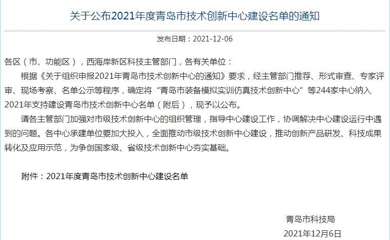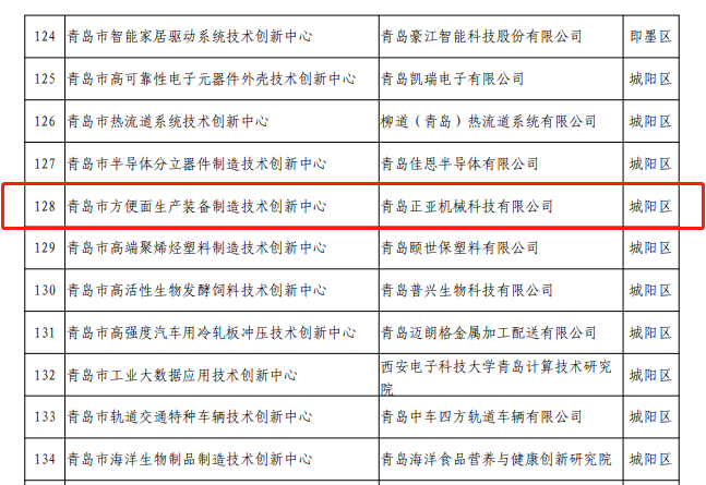 202112月6日,青島市科技局公示了2021年度技術創新中心建設名單,青島正亞機械科技有限公司在眾多參選企業中脫穎而出,成功入選。