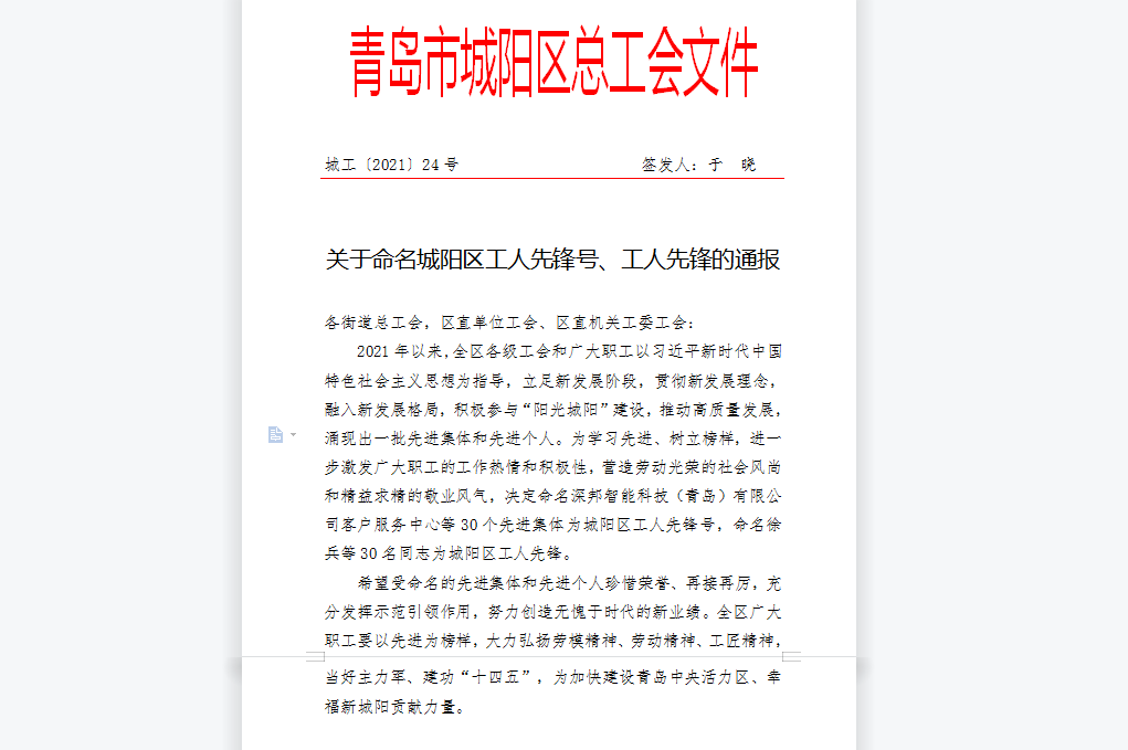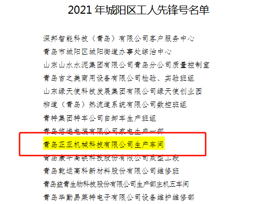 青島正亞機械喜獲“城陽區工人先鋒號”稱號